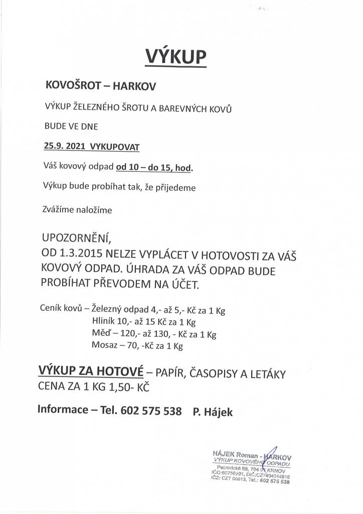 Výkup železného šrotu a barevných kovů 25.9.2021