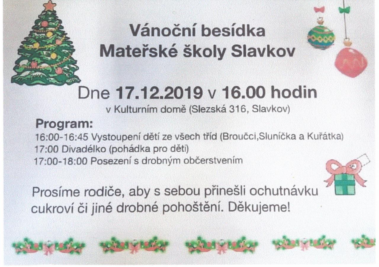 Dne 17.12. od 16 hodin zve Mateřská škola na Vánoční besídku do Kulturního domu Slavkov. Vystoupí děti mateřské školy.