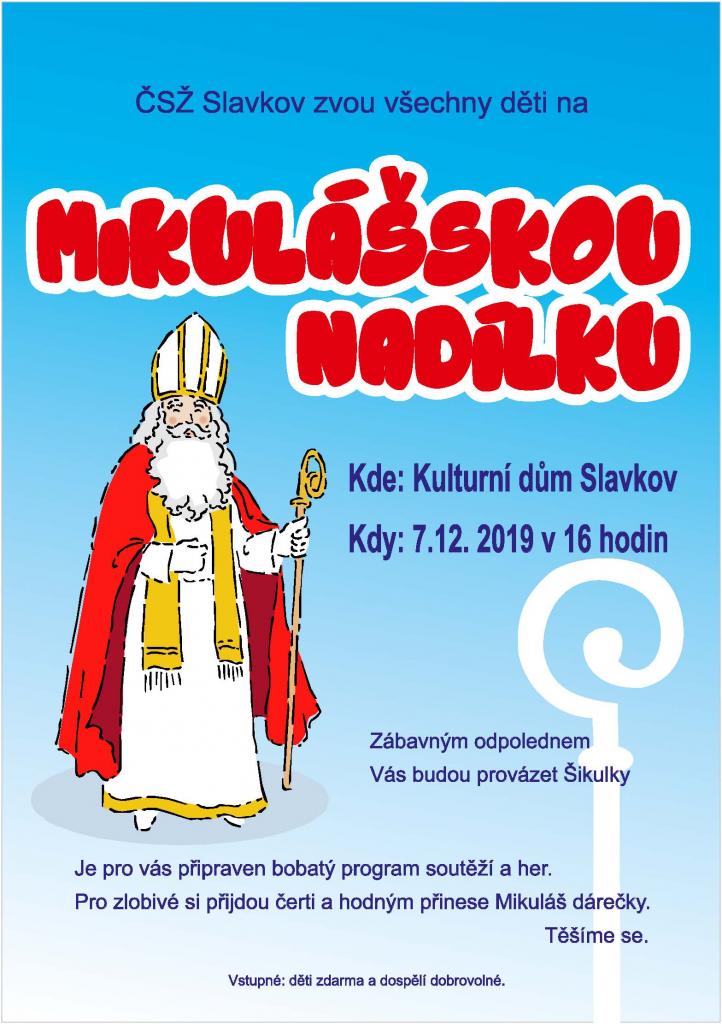 ČSŽ Slavkov zve všechny děti na MIKULÁŠSKÁ NADÍLKU, která se koná v sobotu 7. prosince v 16 hodin v Kulturním domě ve Slavkově. Je pro Vás připraven bohatý program soutěží a her.