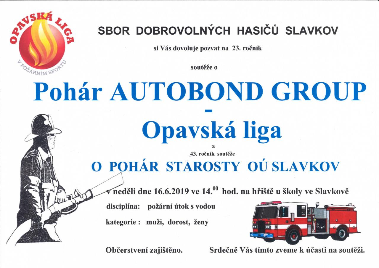 Sbor dobrovolných hasičů Slavkov si Vás dovoluje pozvat na 23. ročník soutěže POHÁR AUTOBOND GROUP - Opavská liga a 43. ročník soutěže o POHÁR STAROSTY OÚ SLAVKOV v neděli 16. 6. 2019 od 14:00 hodin na hřišti u školy ve Slavkově.