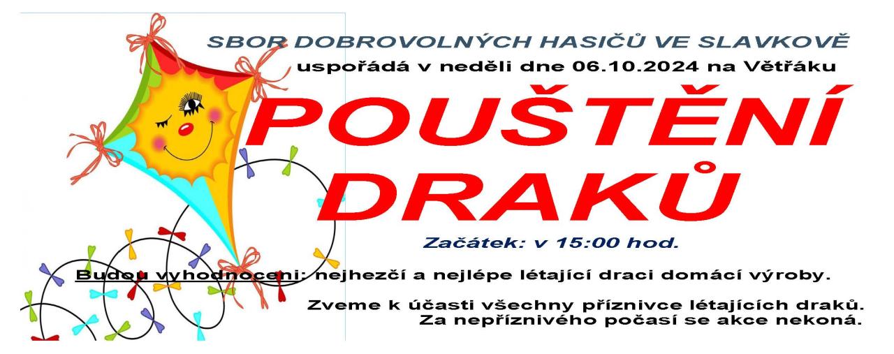 Sbor dobrovolných hasičů ve Slavkově uspořádá v neděli 6. 10. 2024 na Větřáku "Pouštění draků". Začátek je v 15 hodin.