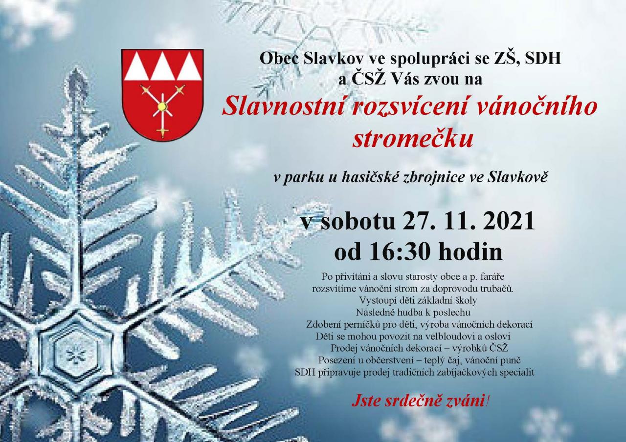 Obec Slavkov ve spolupráci se ZŠ, SDH a ČSŽ Vás zvou na Slavnostní rozsvícení vánočního stromečku v parku u hasičské zbrojnice ve Slavkově