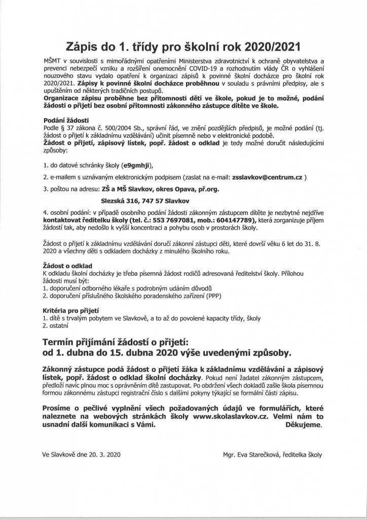 Zápisy k povinné školní docházce proběhnou v souladu s právními předpisy, ale s upuštěním od některých tradičních postupů. Organizace zápisu proběhne bez přítomnosti dětí ve škole, pokud je to možné, podání žádosti o přijetí bez osobní přítomnosti zákonného zástupce dítěte ve škole.