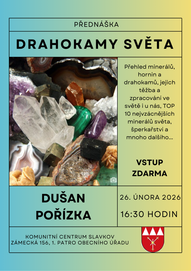 Komunitní centrum Slavkov Vás zve na přednášku pana Dušana Pořízky "Drahokamy světa" ve čtvrtek 26.2.2026 v 16:30 hodin.